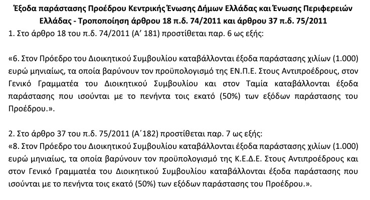 «Στον Πρόεδρο του Διοικητικού Συμβουλίου καταβάλλονται έξοδα παράστασης χιλίων (1.000) ευρώ μηνιαίως, τα οποία βαρύνουν τον προϋπολογισμό της ΕΝ.Π.Ε. Στους Αντιπροέδρους, στον Γενικό Γραμματέα του Διοικητικού Συμβουλίου και στον Ταμία καταβάλλονται έξοδα παράστασης που ισούνται με το πενήντα τοις εκατό (50%) των εξόδων παράστασης του Προέδρου.».