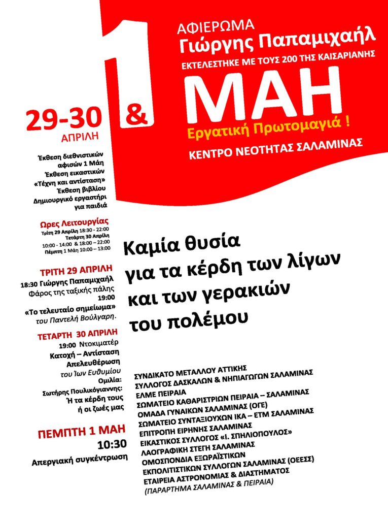 Οι τριήμερες εκδηλώσεις, της Εργατικής Πρωτομαγιάς στη Σαλαμίνα, είναι αφιερωμένες στο Γιώργη Παπαμιχαήλ. Ο Γιώργης Παπαμιχαήλ, ήτανσυνδικαλιστής, Πρόεδρος του «Σωματείου φτυαριστών» στο λιμάνι του... Δυναμώνουμε τον αγώνα για τη ζωή μας και όχι για τα κέρδη τους!