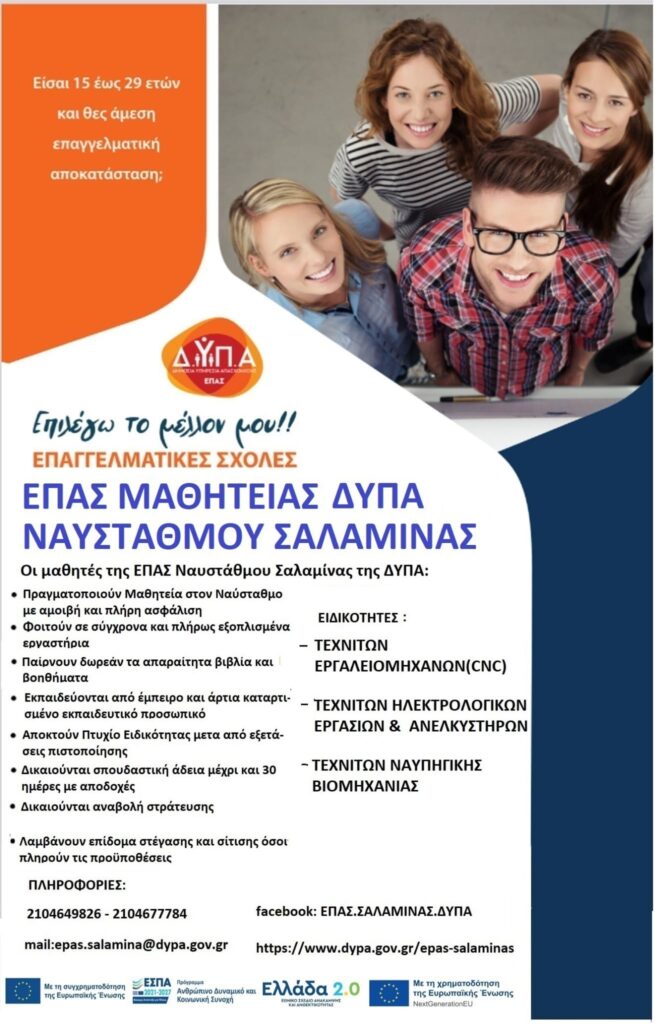 ΕΙΣΑΙ 15-29 ΕΤΩΝ; ΨΑΧΝΕΙΣ ΕΠΑΓΓΕΛΜΑ ΜΕ ΜΕΛΛΟΝ; ΕΛΑ ΣΤΗΝ ΕΠΑ.Σ. ΝΑΥΣΤΑΘΜΟΥ ΣΑΛΑΜΙΝΑΣ ΤΗΣ Δ.ΥΠ.Α.!
