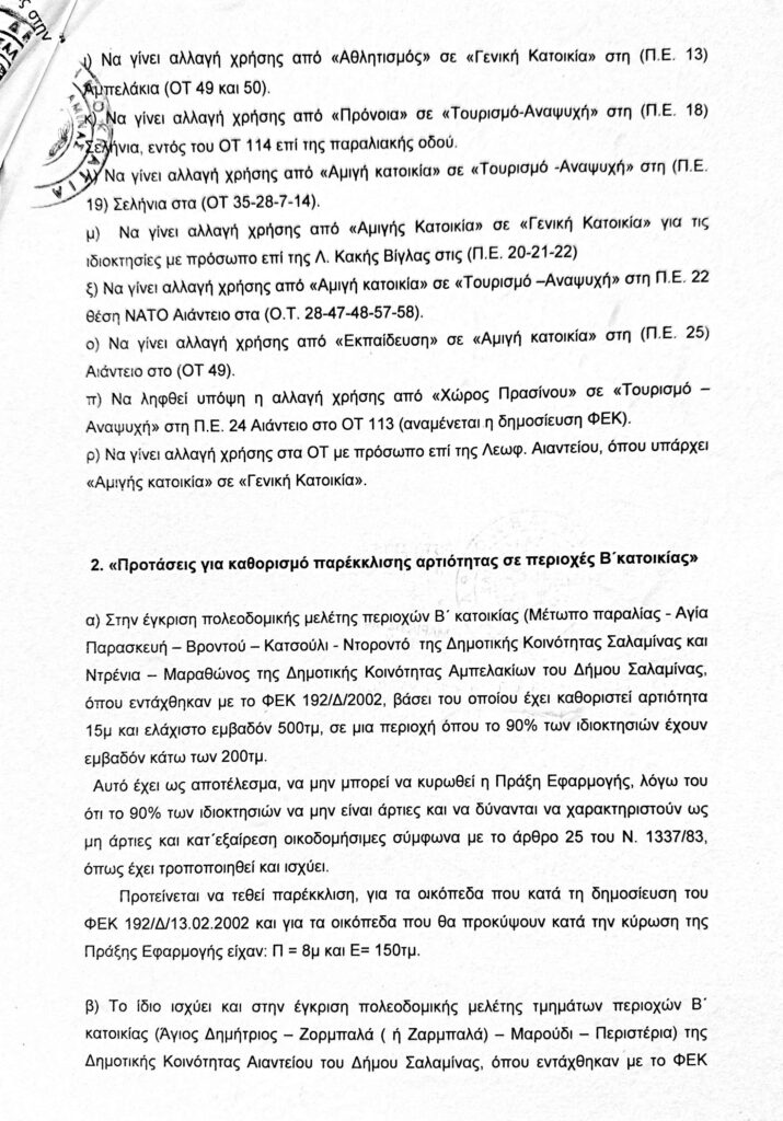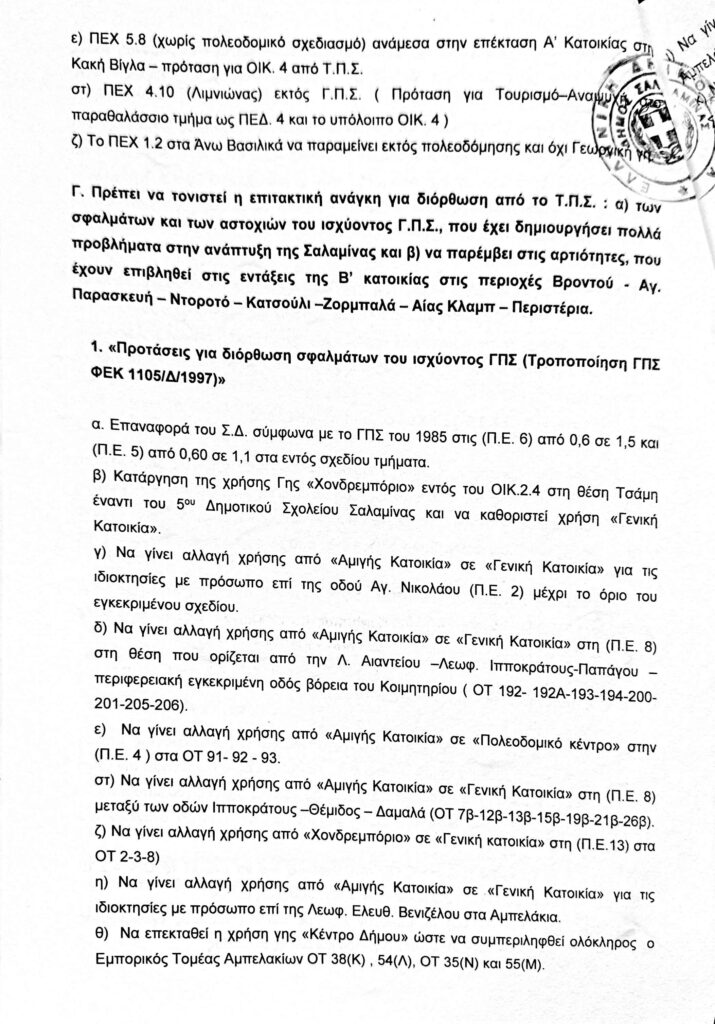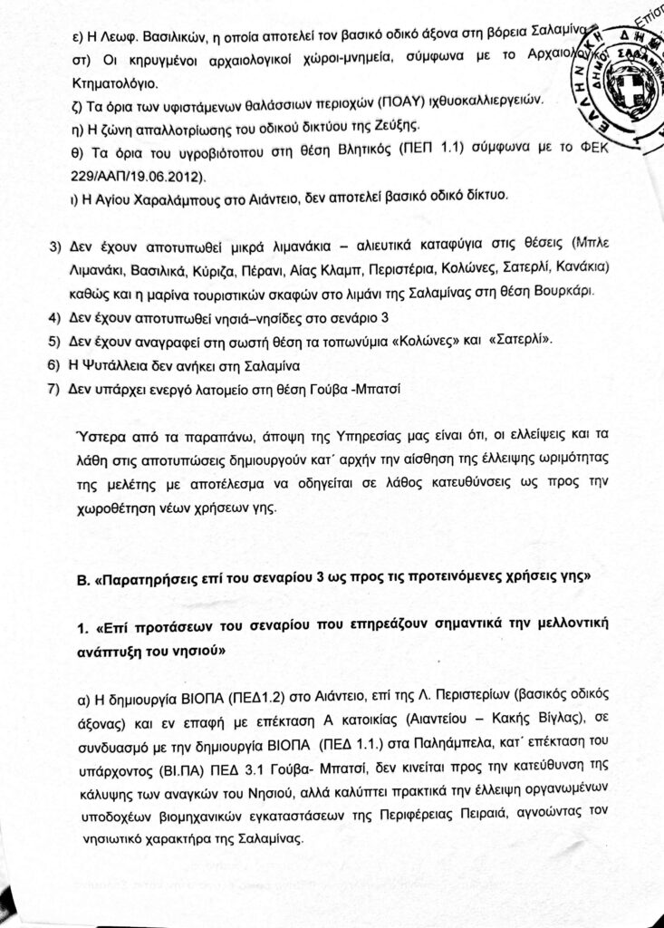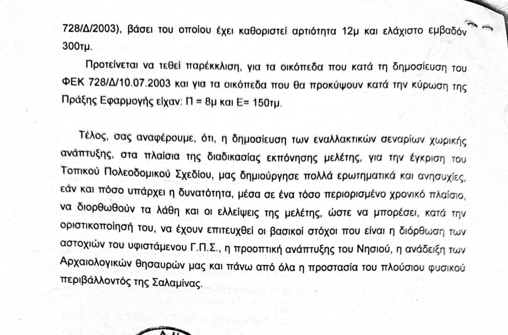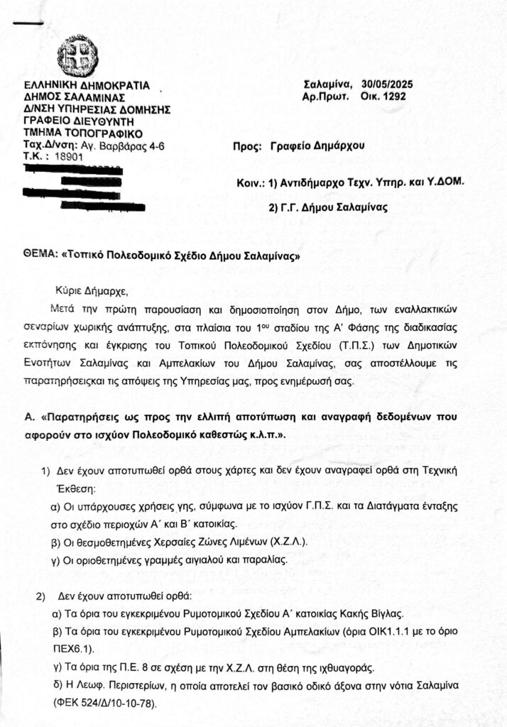 Όπως δημοσιεύτηκε στην ενημερωτική ιστοσελίδα «Φωνή της Σαλαμίνας», επί της παρουσίασης της μελέτης για το Τοπικό Πολεοδομικό Σχέδιο, από την Υπηρεσία Δόμησης του Δήμου Σαλαμίνας απεστάλη το παρακάτω έγγραφο υποδείξεων περί των λαθών που διαπιστώθηκαν, αλλά και υποβολής παρατηρήσεων. Το παραθέτουμε αυτούσιο καθώς δείχνει ξεκάθαρα το εύρος των αντιδράσεων από φορείς και επαγγελματίες του χώρου, οι οποίοι προφανώς βρέθηκαν προ τετελεσμένων σε μια διαδικασία που κρατήθηκε, ουσιαστικά, εν κρυπτώ και παραβύστω (δεν είναι δημόσια ανακοίνωση μια ανάρτηση στο προσωπικό προφίλ ενός αντιδημάρχου στο facebook ούτε η δημιουργία ενός συνδέσμου στο site του δήμου που οδηγεί στην πλατφόρμα του ΥΠΕΝ και στην οποία εισήχθησαν στοιχεία την επόμενη της παρουσίασης ημέρα…).