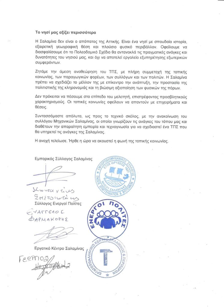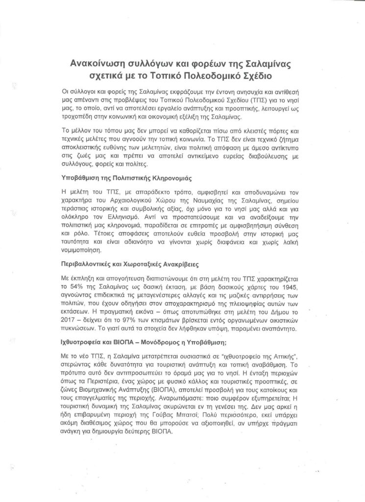 Ανακοίνωση Συλλόγων και Φορέων της Σαλαμίνας σχετικά με το Τοπικό Πολεοδομικό Σχέδιο