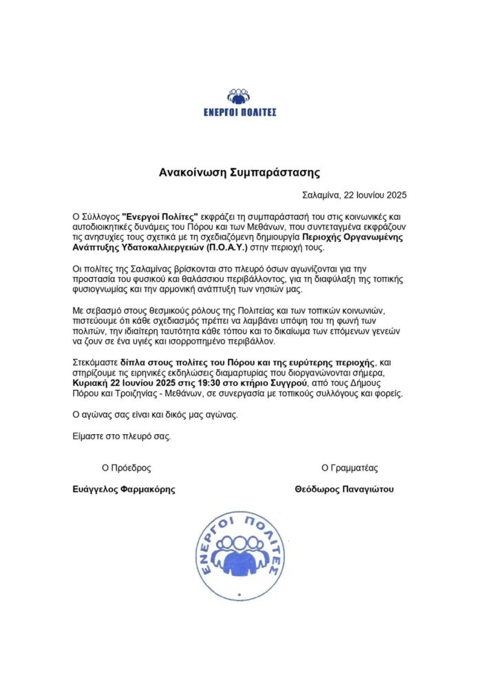 Ο Σύλλογος “Ενεργοί Πολίτες” εκφράζει τη συμπαράστασή του στις κοινωνικές και αυτοδιοικητικές δυνάμεις του Πόρου και των Μεθάνων, που συντεταγμένα εκφράζουν τις ανησυχίες τους σχετικά με τη σχεδιαζόμενη δημιουργία Περιοχής Οργανωμένης Ανάπτυξης Υδατοκαλλιεργειών (Π.Ο.Α.Υ.) στην περιοχή Τούρλος.