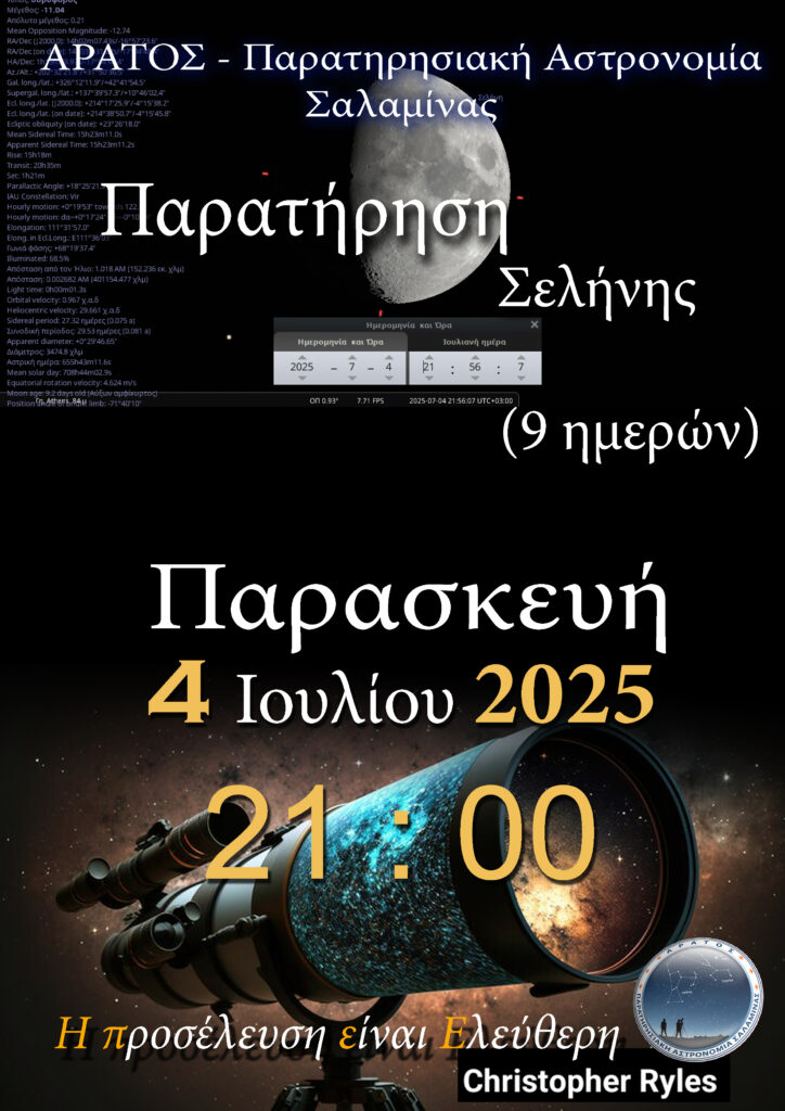 Η ομάδα μας, καιρού επιτρέποντος, θα κάνει παρατήρηση Σελήνης η οποία θα βρίσκεται σε φάση 9 ημερών από ώρας 21:00 την ερχόμενη Παρασκευή 4 Ιουλίου. Η παρατήρηση, όπως πάντα, θα γίνει στη Σαλαμίνα και συγκεκριμένα στην λεγόμενη ‘’παραλία’’ της Σαλαμίνας πίσω από την ‘’Πέτρινη στάση’’.