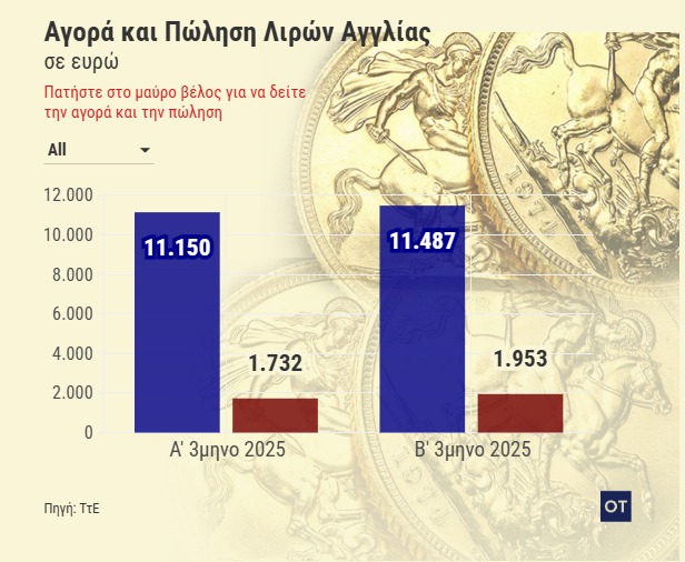 Σύμφωνα με στοιχεία, στο δεύτερο τρίμηνο 2025, οι ιδιώτες αγόρασαν από την Τράπεζα της Ελλάδος (ΤτΕ) μόλις 1.953 χρυσές λίρες, ενώ πούλησαν προς την ΤτE 11.487 χρυσές λίρες.