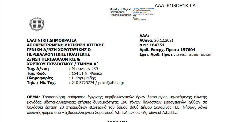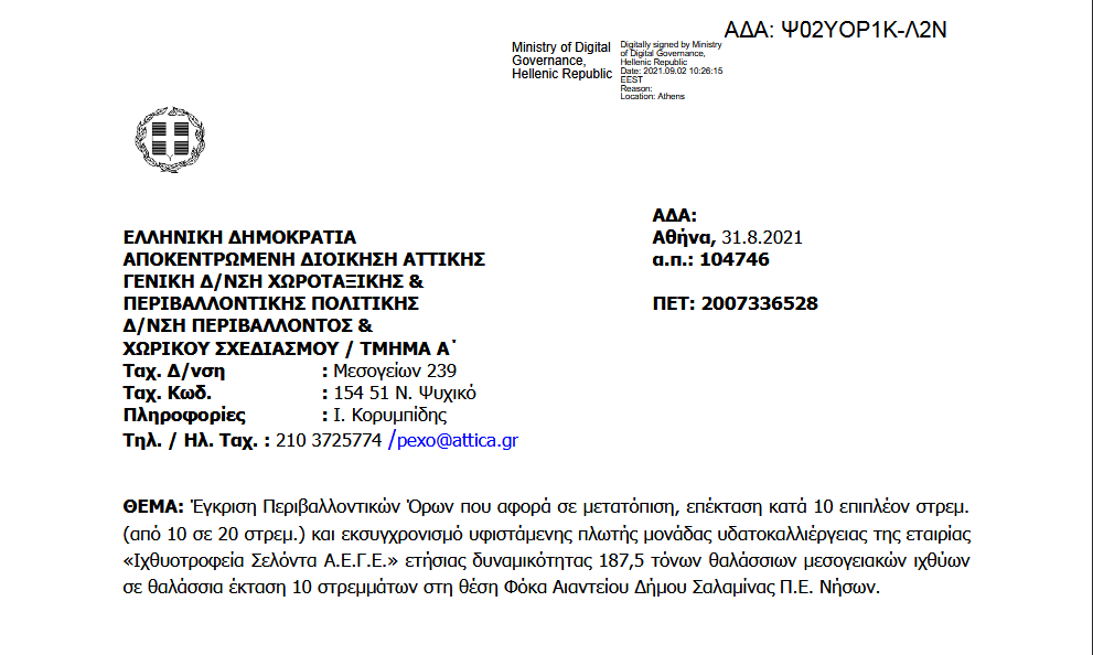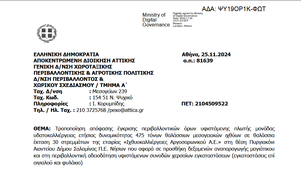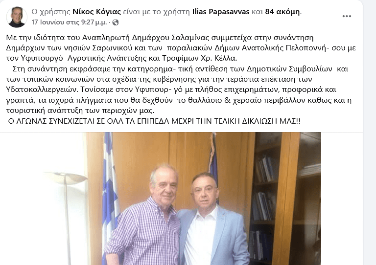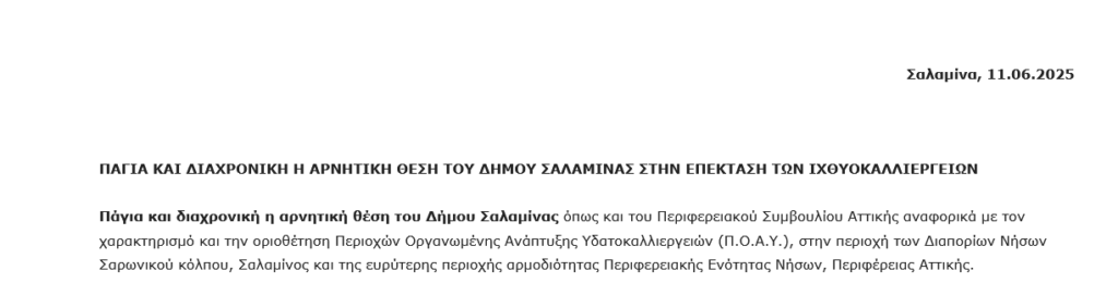 Στις 11 Ιουνίου 2025 ο κ. Δήμαρχος γράφει στη σελίδα του Δήμου : Πάγια και διαχρονική αρνητική θέση του Δήμου Σαλαμίνας στην επέκταση των Ιχθυοκαλλιεργειών και ο κ Κόγιας συμπληρώνει (φωτό) ….. «είμαστε αντίθετοι σε κάθε είδους επέκταση των Ιχθυοκαλλιεργειών»!!!