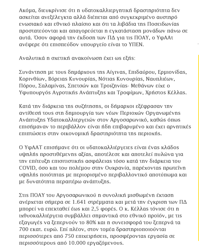 Την επόμενη μέρα ο Υφυπουργός Ανάπτυξης κ. Κέλλας βγάζει ανακοίνωση (φωτό) όπου μεταξύ των άλλων αναφέρει πόσο απαραίτητες είναι οι Ιχθυοκαλλιέργειες για την Εθνική οικονομία , ότι δουλεύουν χιλιάδες εργαζόμενοι και ότι τα ψάρια από τα ιχθυοτροφεία παρέχουν ……..πρωτεΐνη υψηλής ποιότητας (ψαράδες σταματήστε να ψαρεύετε η τσιπούρα Ιχθυοτροφείου είναι η καλύτερη)…. και τοποθετείται σαφέστατα ότι οι ΠΟΑΥ θα προχωρήσουν και μάλιστα σύντομα……