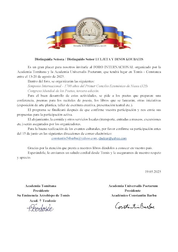 Από 13 μέχρι και 20 Αυγούστου, και υπό την αιγίδα της Ιεράς Αρχιεπισκοπής Tomis, και του Σεβασμιοτάτου Αρχιεπισκόπου Θεοδοσίου, στην πόλη Κωνστάντσα της Ρουμανίας, η Διεθνής Ακαδημία Tomitana και η Academia Universalis Poetarum, των οποίων προεδρεύει ο διακεκριμένος φιλόσοφος Constantin Barbu, διοργανώνεται εφέτος, το Τρίτο Διεθνές Φόρουμ, στο οποίο λαμβάνουν μέρος διεθνώς αναγνωρισμένοι Ακαδημαϊκοί καθηγητές από όλον τον κόσμο, καθώς και διεθνώς αναγνωρισμένες προσωπικότητες των Γραμμάτων και των Επιστημών.