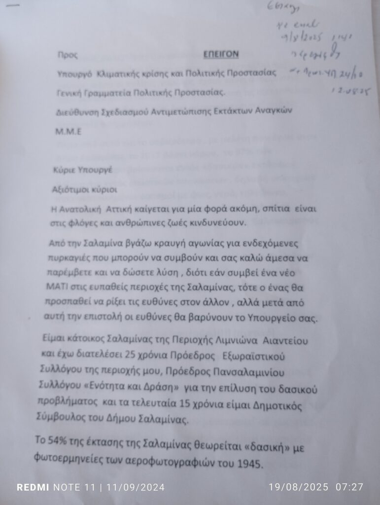 Επιστολή – καταγγελία έστειλα στον Υπουργό Κλιματικής Κρίσης και Προστασίας του Πολίτη στις 9/8/2025 μετά την απάντηση την οποία έστειλε ο Αντιδήμαρχος Πολιτικής προστασίας κ. Ναννος σε πολίτη στα Βασιλικά , o οποίος ζητούσε να καθαριστεί οικόπεδο δίπλα στη οικία του το οποίο είναι επικίνδυνο για ενδεχόμενη πυρκαγιά. Η απάντηση ήταν, ότι δεν μπορούμε να παρέμβουμε, γιατί η περιοχή θεωρείται δασική έκταση!!!!!