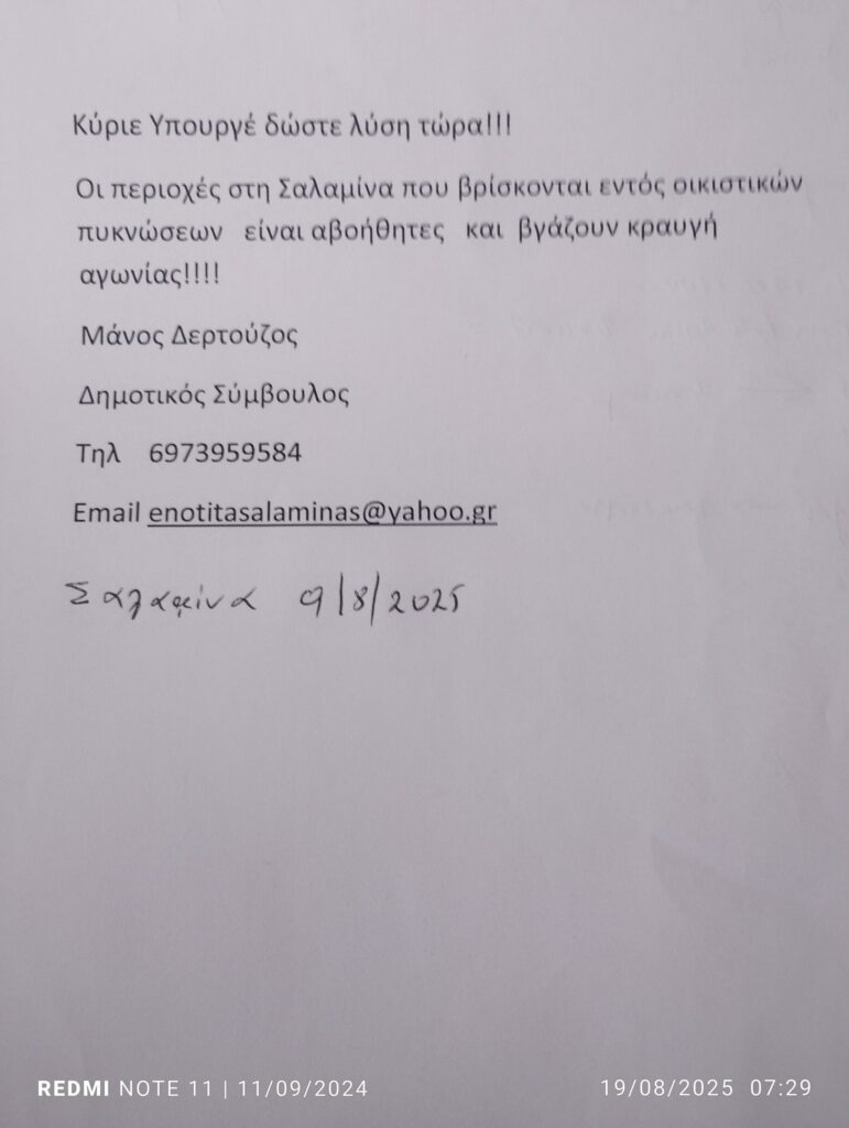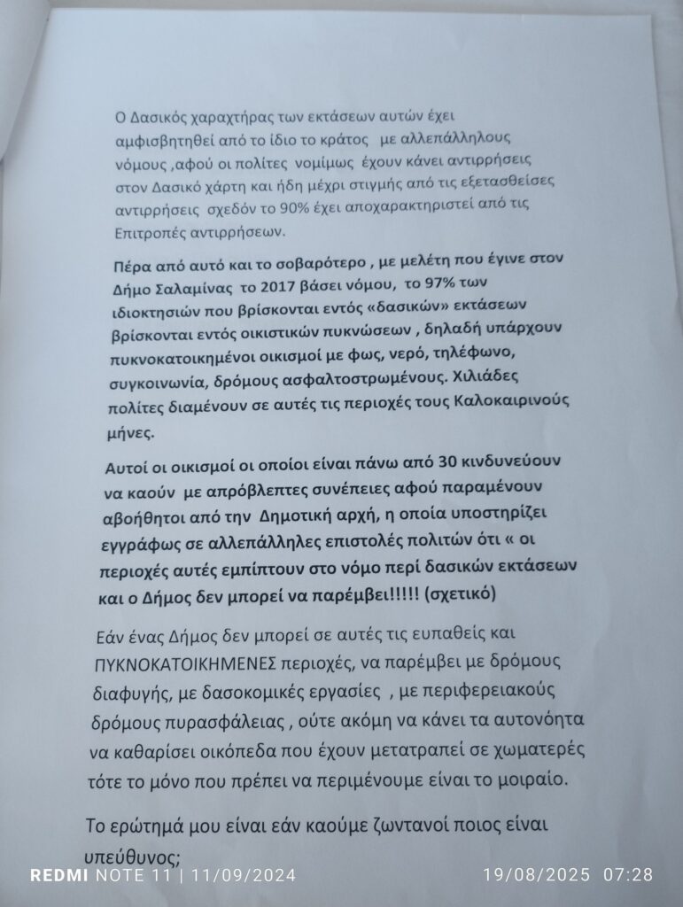 Μετά την καταγγελία μου άμεσα δόθηκε εντολή στις αρμόδιες υπηρεσίες να επιληφθούν του θέματος. Μιλάμε για το 54% της Σαλαμίνας το οποίο θεωρείται φερομενη δασική έκταση που σήμερα ομως πυκνοκατοικειται!!!!