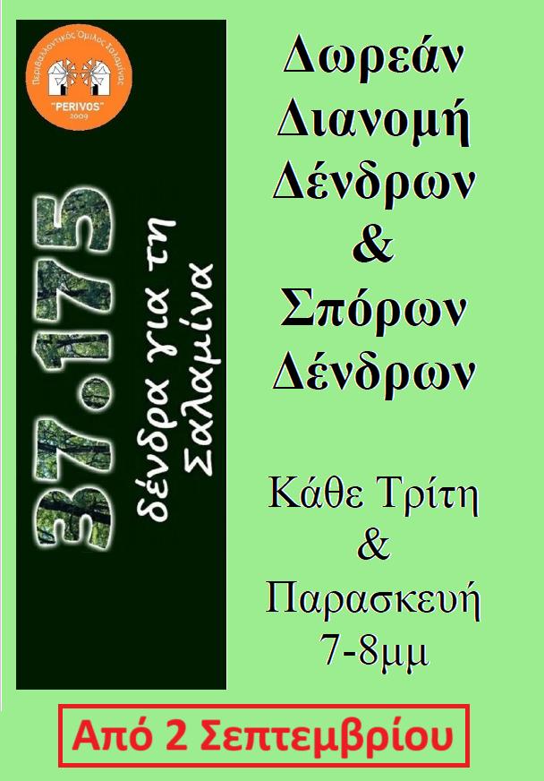 Στις 2 Σεπτεμβρίου 2025 ο ΠΕΡΙΒ.Ο.Σ ξεκινάει την 3η δωρεάν διάθεση δένδρων στα πλαίσια της δράσης του 37.175 δένδρα για τη Σαλαμίνα. Συνολικά θα... 3η δωρεάν διάθεση δένδρων και σπόρων δένδρων