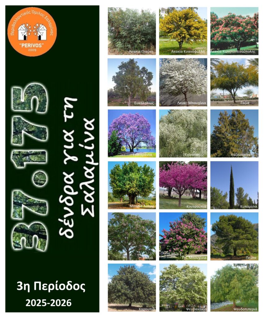 Στις 2 Σεπτεμβρίου 2025 ο ΠΕΡΙΒ.Ο.Σ ξεκινάει την 3η δωρεάν διάθεση δένδρων στα πλαίσια της δράσης του 37.175 δένδρα για τη Σαλαμίνα. Συνολικά θα χαριστούν 300 δενδρύλλια από 18 είδη δένδρων (δείτε τη φωτογραφία) που δημιουργήθηκαν από σπόρους δένδρων που συλλέξαμε. Παράλληλα θα χαριστούν χιλιάδες σπόροι δένδρων για όσους θέλουν να δημιουργήσουν τα δικά τους φυτώρια. (δείτε ενδεικτική λίστα παρακάτω η οποία δεν είναι τελική καθώς δεν έχει ολοκληρωθεί ακόμη η συλλογή των σπόρων).