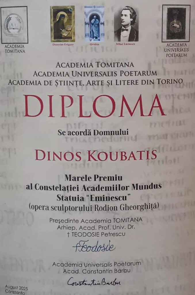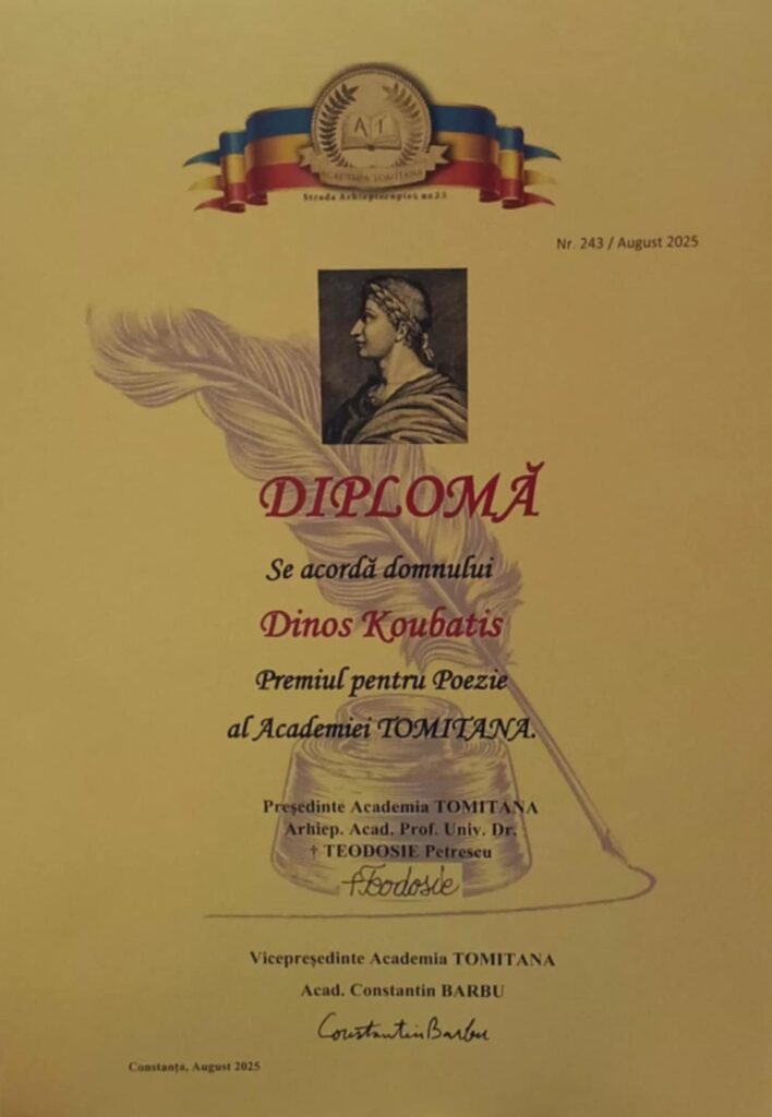 Στο Τρίτο Συνέδριο της Ακαδημίας «ΤΟΜΙΤΑΝΑ» στην Κωνστάντσα της Ρουμανίας, βρέθηκε προσκεκλημένος τιμητικά ο Ντίνος Κουμπάτης, καθώς και η σύζυγός του Λίλυ Νούραη-Κουμπάτη, και επέστρεψαν με πολλές τιμητικές διακρίσεις.