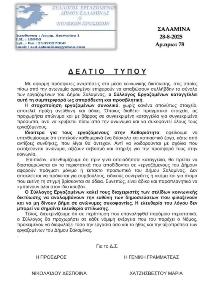 Με αφορμή ανώνυμες αναρτήσεις στα μέσα κοινωνικής δικτύωσης που απαξιώνουν συλλογικά το προσωπικό του Δήμου Σαλαμίνας, ο Σύλλογος Εργαζομένων εξέδωσε σχετική ανακοίνωση.