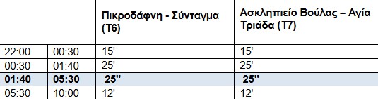 Συχνότητες διέλευσης γραμμών Τ6 και Τ7 του Τραμ από 22:00 έως 10:00