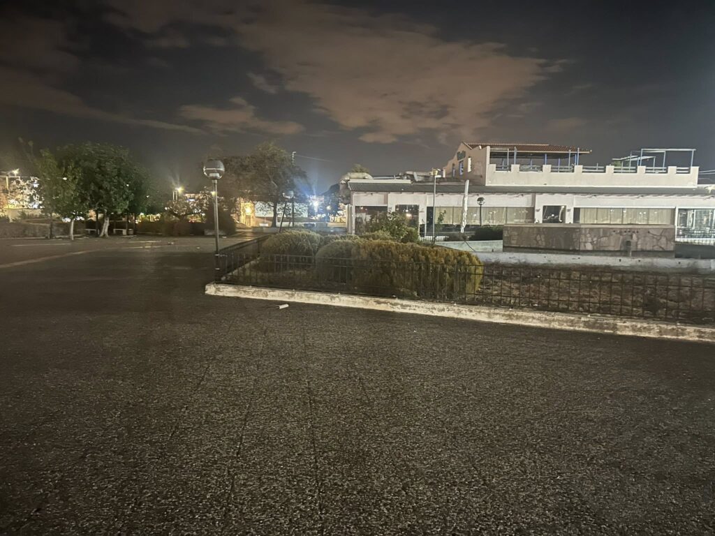 Στη Σαλαμίνα, η Πλατεία Εθνικής Αντίστασης παραμένει βυθισμένη στο σκοτάδι, την ώρα που ο υπόλοιπος δημόσιος χώρος του νησιού φωτίζεται κανονικά.