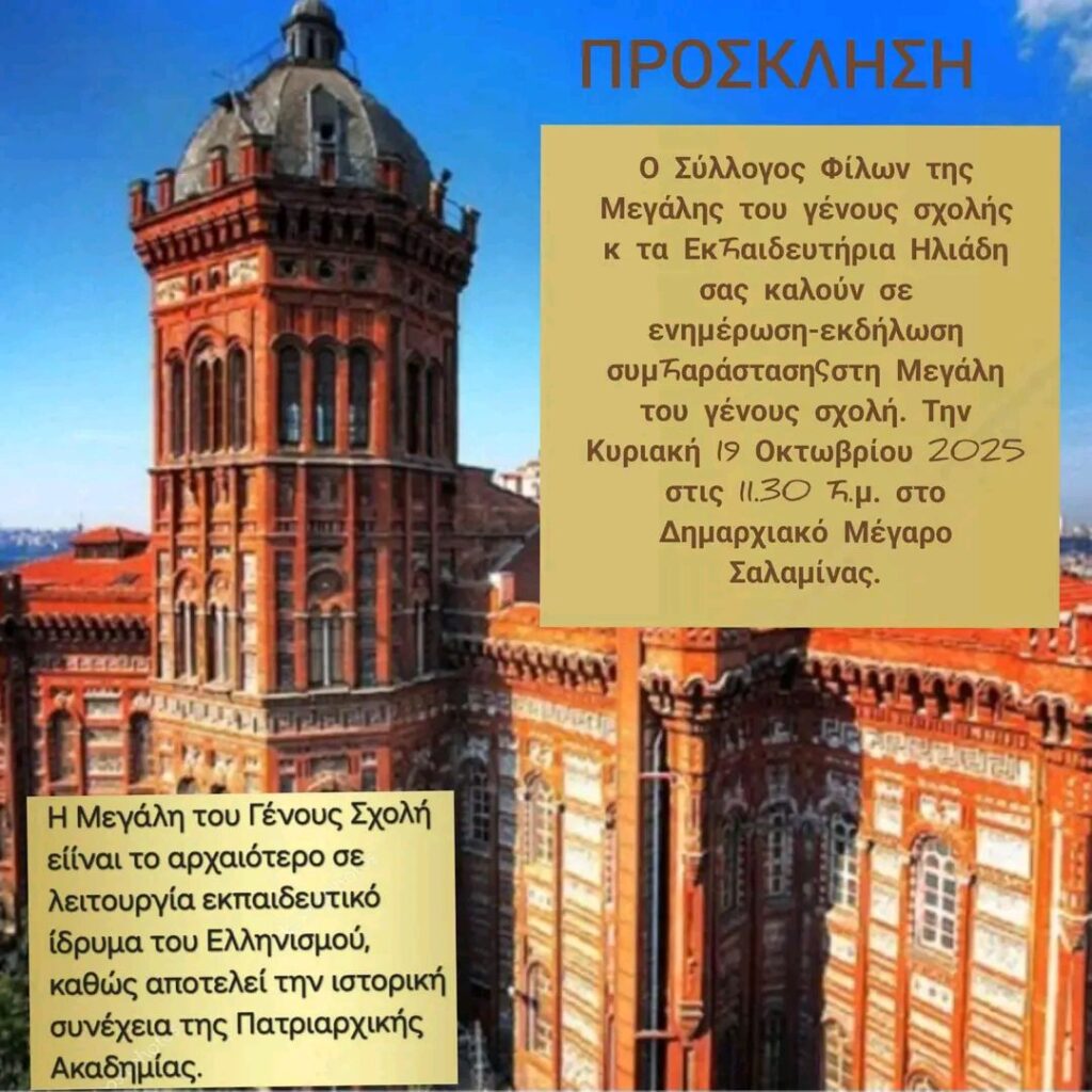 Ο Σύλλογος Φίλων της Μεγάλης του Γένους Σχολής και τα Εκπαιδευτήρια Ηλιάδη διοργανώνουν εκδήλωση ενημέρωσης και συμπαράστασης προς τη Μεγάλη του Γένους Σχολή, την Κυριακή 19 Οκτωβρίου 2025, στις 11:30 το πρωί, στο Δημαρχιακό Μέγαρο Σαλαμίνας.