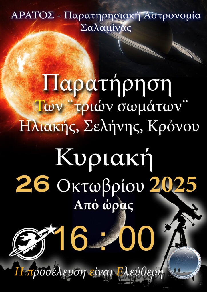 Η ομάδα μας σας καλεί σε μια τριπλή παρατήρηση ήτοι Ηλιακής από ώρας 16:00 έως δύσης, στη συνέχεια Σεληνιακής (Σελήνη 4,8 ημερών) και πλανήτη Κρόνου, την Κυριακή 26 Οκτωβρίου. Και αυτή η παρατήρηση, όπως συνήθως, θα γίνει ΚΑΙΡΟΥ ΕΠΙΤΡΕΠΟΝΤΟΣ στη Σαλαμίνα και συγκεκριμένα στην λεγόμενη ‘’παραλία’’ της Σαλαμίνας πίσω από την ‘’Πέτρινη στάση’’.