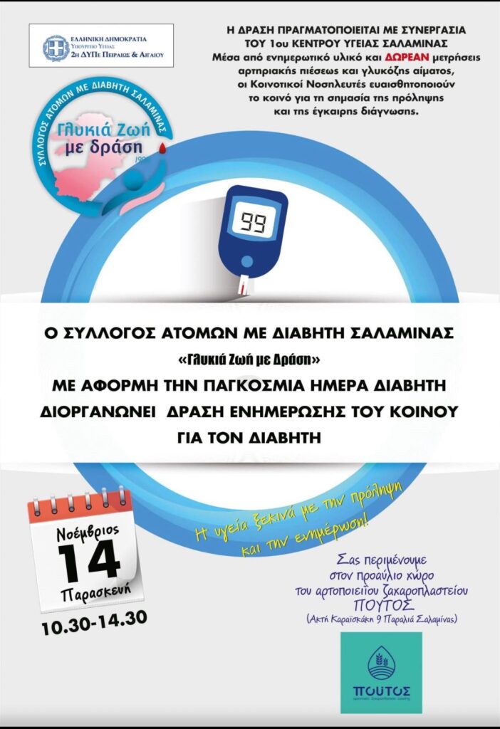 Με αφορμή την Παγκόσμια Ημέρα για τον Σακχαρώδη Διαβήτη, που είναι στις 14 Νοεμβρίου, το 1ο Κέντρο Υγείας Σαλαμίνας σε συνεργασία με τον Σύλλογο Διαβητικών Σαλαμίνας «Γλυκιά Ζωή με δράση» οργανώνει δράση ευαισθητοποίησης του κοινού.