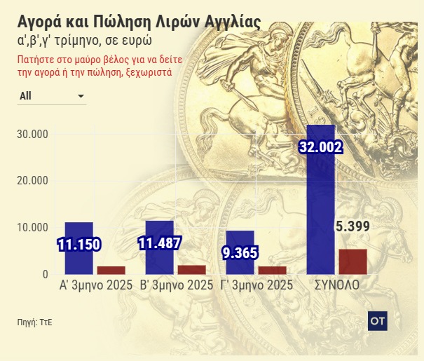 Σύμφωνα με στοιχεία, στο τρίτο τρίμηνο 2025, οι ιδιώτες αγόρασαν από την Τράπεζα της Ελλάδος (ΤτΕ) μόλις 1.714 χρυσές λίρες, ενώ πούλησαν προς την ΤτE 9.365 χρυσές λίρες.