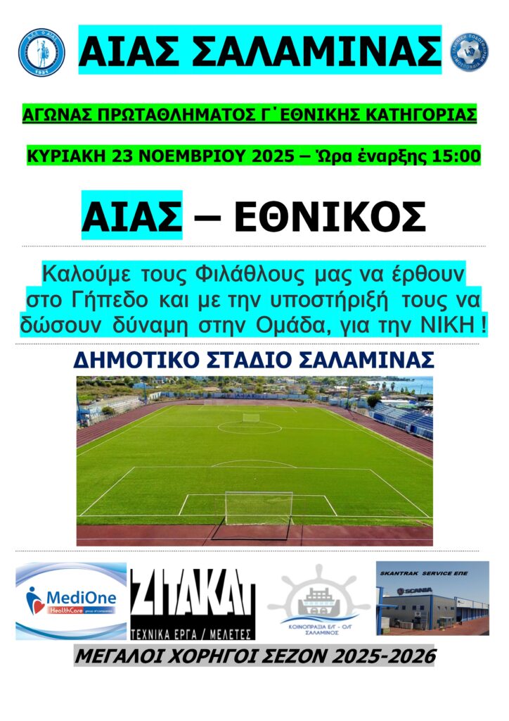 Αίας Σαλαμίνας – Εθνικός. Αγώνας Πρωταθλήματος.