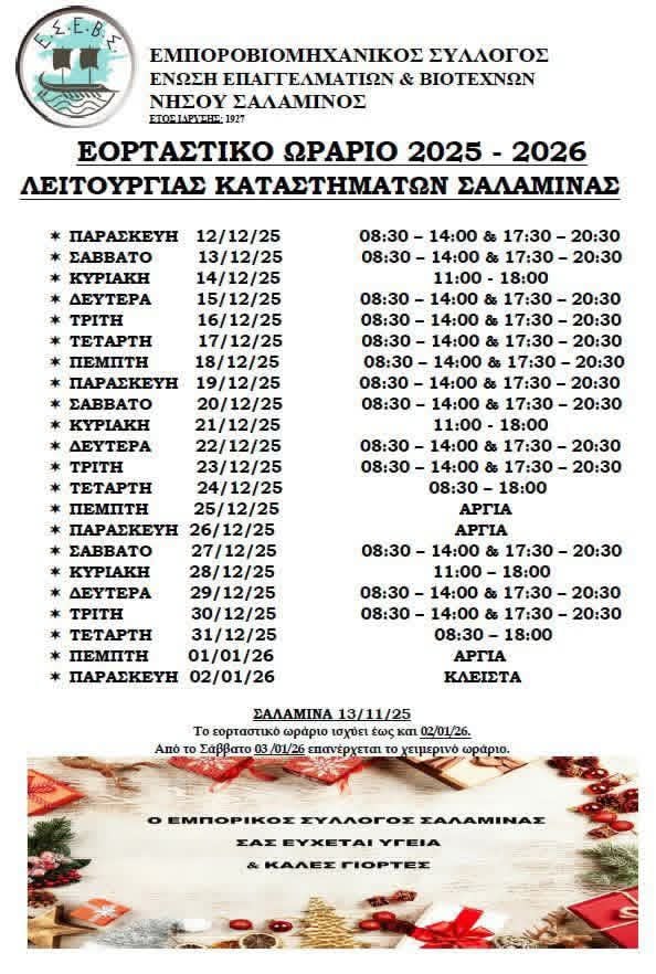 Εορταστικό Ωράριο 2025-2026 λειτουργίας καταστημάτων Σαλαμίνας