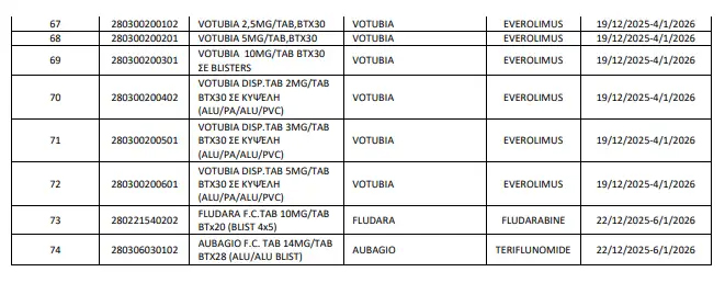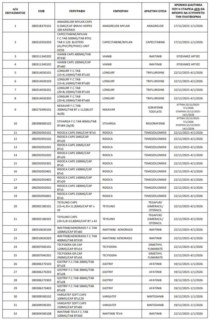 Στην ανακοίνωση αναφέρεται πως κατά την περίοδο των Χριστουγέννων και λόγω αδυναμίας ορισμένων φαρμακευτικών και μεταφορικών εταιρειών, η διεκπεραίωση αιτημάτων για χορήγηση Φαρμάκων Υψηλού Κόστους από ιδιωτικά φαρμακεία που υποβάλλονται μέσω της πλατφόρμας θα είναι δυνατή σύμφωνα με τον πίνακα, ο οποίος περιλαμβάνεται στην ανακοίνωση.
