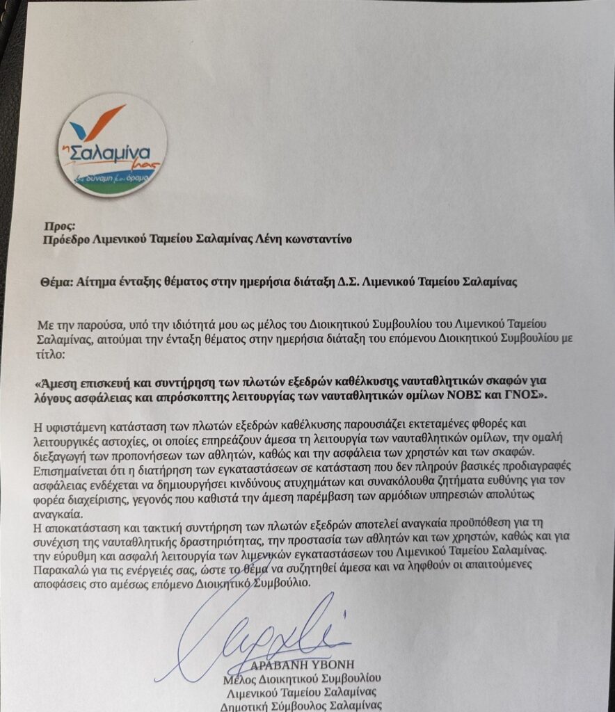 Υβόνη Αραβανή. Αίτημα ένταξης θέματος στην ημερήσια διάταξη Δ.Σ. Λιμενικού Ταμειου Σαλαμίνας