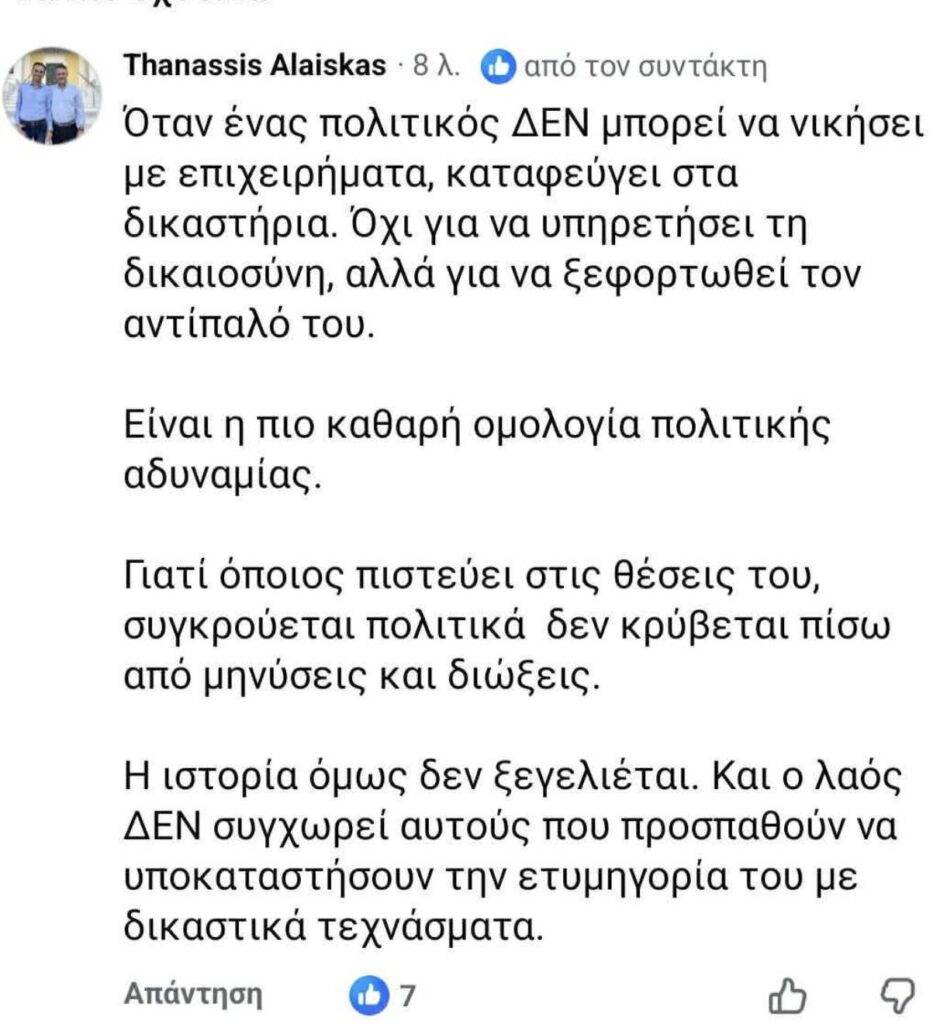 Η αποφυγή δημόσιου διαλόγου μπορεί να λειτουργεί προσωρινά ως ασπίδα, αλλά μακροπρόθεσμα πλήττει την εμπιστοσύνη και τη θεσμική αξιοπιστία. Η δημοκρατία δεν μετριέται μόνο από την τυπική προσφυγή στη Δικαιοσύνη, αλλά και από την ικανότητα μιας δημοτικής αρχής να συνδυάζει θεσμική προστασία με ανοιχτή, διαφανή πολιτική συζήτηση.
