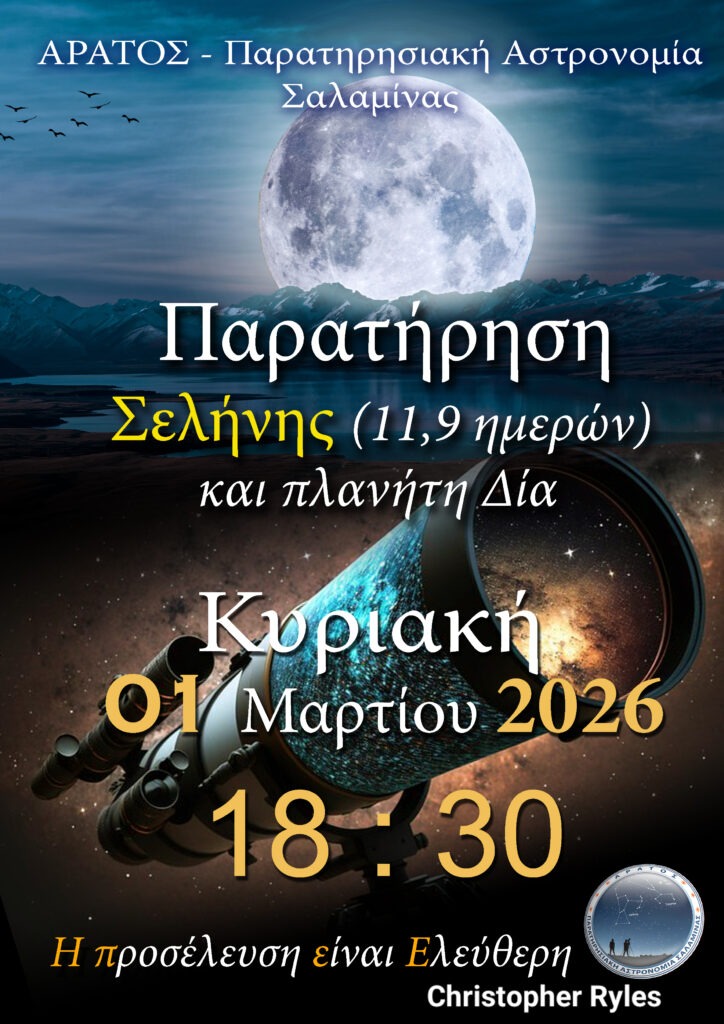 Η ομάδα μας σας καλεί στη πρώτη παρατήρησή της για τη νέα χρονιά -έστω και καθυστερημένα. Πρόκειται για παρατήρηση Σελήνης και του πλανήτη Δία η οποία θα ξεκινήσει στις 18:30. Και αυτή η παρατήρηση, όπως συνήθως, θα γίνει ΚΑΙΡΟΥ ΕΠΙΤΡΕΠΟΝΤΟΣ στη Σαλαμίνα και συγκεκριμένα στην λεγόμενη ‘’παραλία’’ της Σαλαμίνας πίσω από την ‘’Πέτρινη στάση’’ την Κυριακή 01 Μαρτίου.