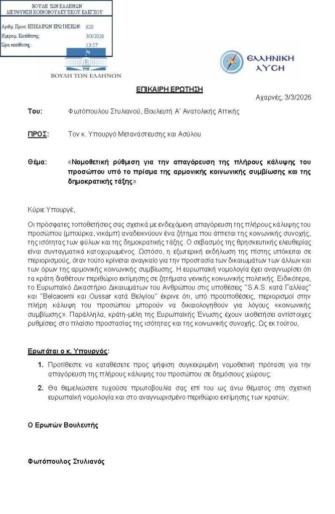 Μετά από παρέμβαση της Ελληνικής Λύσης και Επίκαιρη Ερώτηση του βουλευτή Ανατολικής Αττικής Στέλιου Φωτόπουλου ο υπουργός Μεταναστευτικής Πολιτικής δεσμεύτηκε να καταργήσει δια νόμου την μπούρκα στην Ελληνική Επικράτεια.