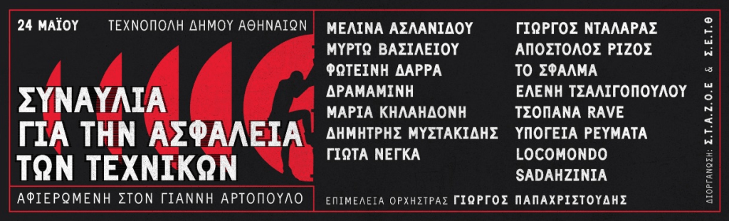 Το Εργατοϋπαλληλικό Κέντρο Σαλαμίνας στηρίζει την Συναυλία που διοργανώνει το Σωματείο Ελλήνων Τεχνικών Θεάτρου (Σ.Ε.Τ.Θ) και το Σωματείο Τεχνικών Απασχολούμενων σε Ζωντανές Οπτικοακουστικές Εκδηλώσεις (Σ.Τ.Α.Ζ.Ο.Ε) αφιερωμένη στον συνάδελφο τους Γιάννη Αρτόπουλο που σκοτώθηκε στον δρόμο της δουλειάς.